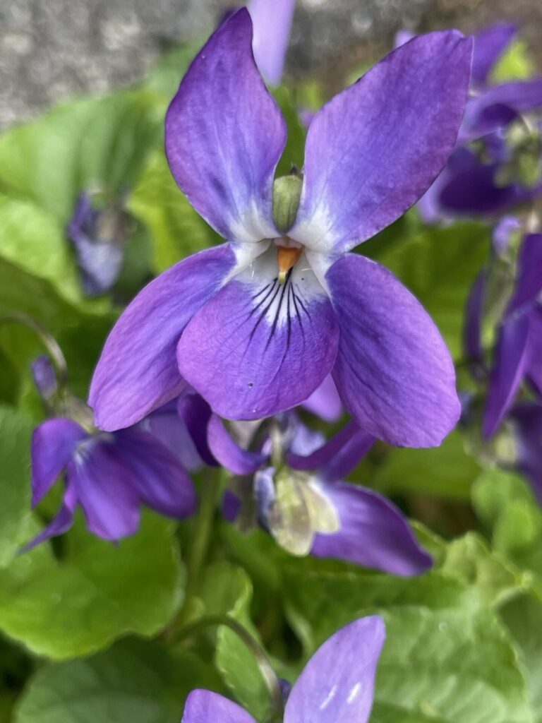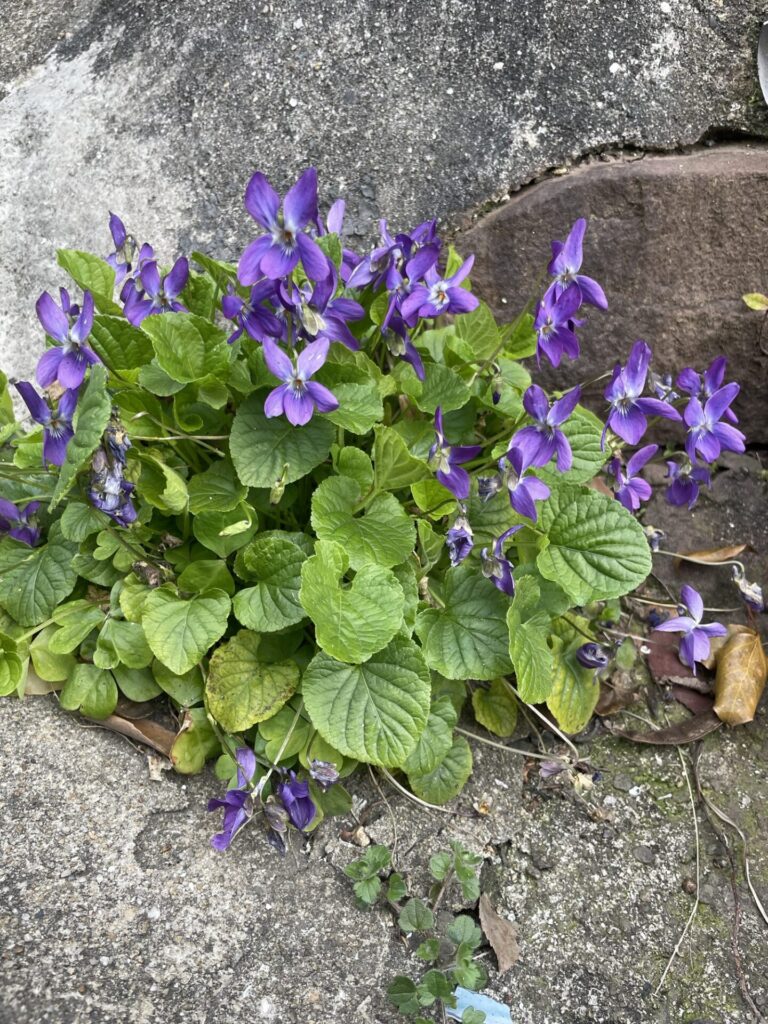 スミレってアスファルトの隙間に連なって咲いてる気がする。名前は当然知ってたんだけど、実は身近に咲いてるなんて思ってなかった。去年も数輪見つけて喜んでたんだけど、ちーくんと散歩をしたら至るところに咲いてることに気づいた。